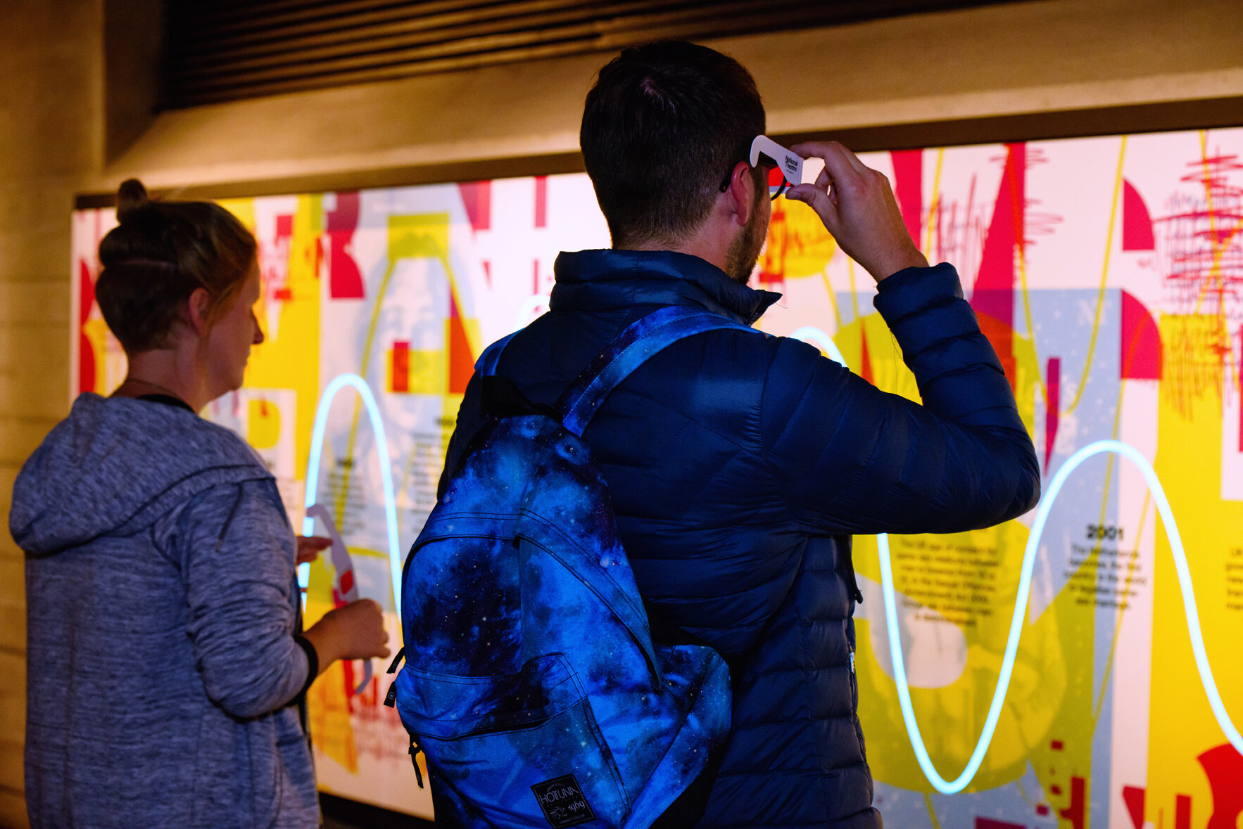 The exhibition used retro ‘decoder glasses’ to allow readers to reveal a hidden timeline of queer social and historical events, and personal accounts, which ran parallel with a mainstream NT timeline. The exhibition was accompanied by a video piece in which people held up hand-written signs with the name of their queer heroes on, as well as a space for visitors to add the name of their own queer hero to the wall.
